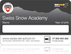 Die Swiss Snow Academy Card ist Deine persönliche «Keycard». Sie weist Dich als Mitglied aus und bestätigt jeden Turn, Air oder Trick, den Du beherrschst. Doch Deine Swiss Snow Academy Card kann noch mehr: Auf sie kannst Du dein Abo für die Bergbahnen laden. Nicht genug damit: Mit Deiner Swiss Snow Academy Card profitierst Du von weiteren Spezialangeboten der Swiss Snow Academy.